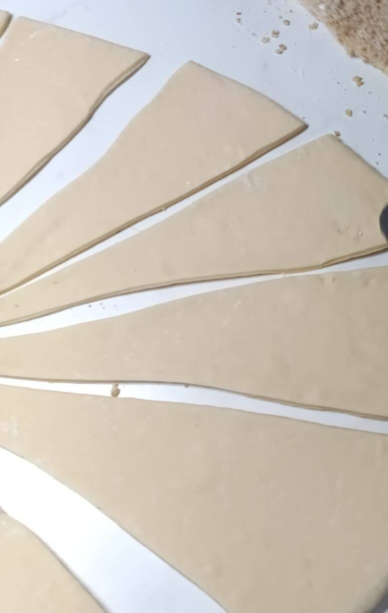 Teig auf einer bemehlten Arbeitsfläche dünn ausrollen und in ca. 14 gleich große Stücke portionieren.