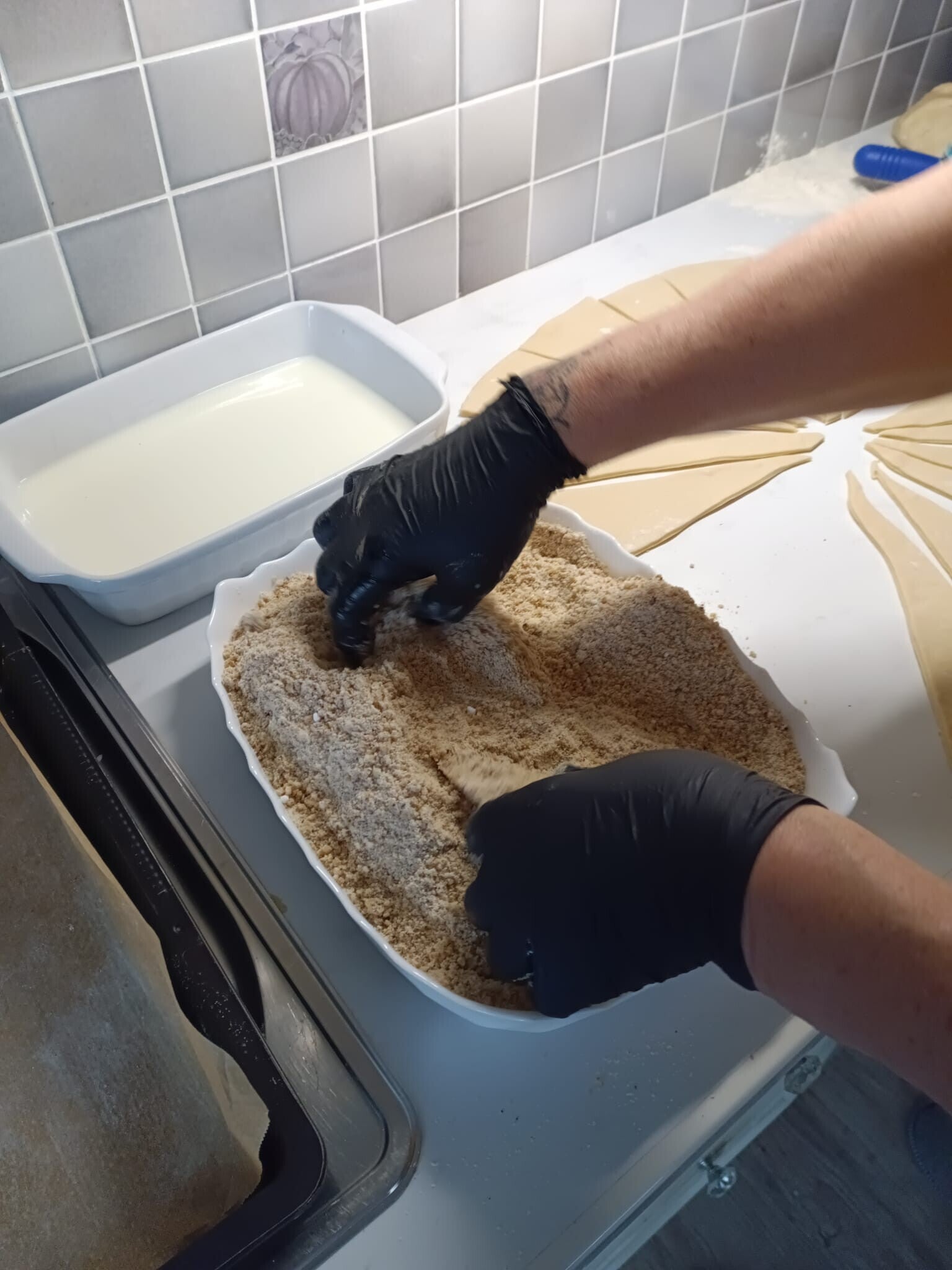 Währenddessen Walnüsse, Haselnüsse, Staubzucker und optional Zimt vermischen und die Milch in einen zweiten Behälter geben.