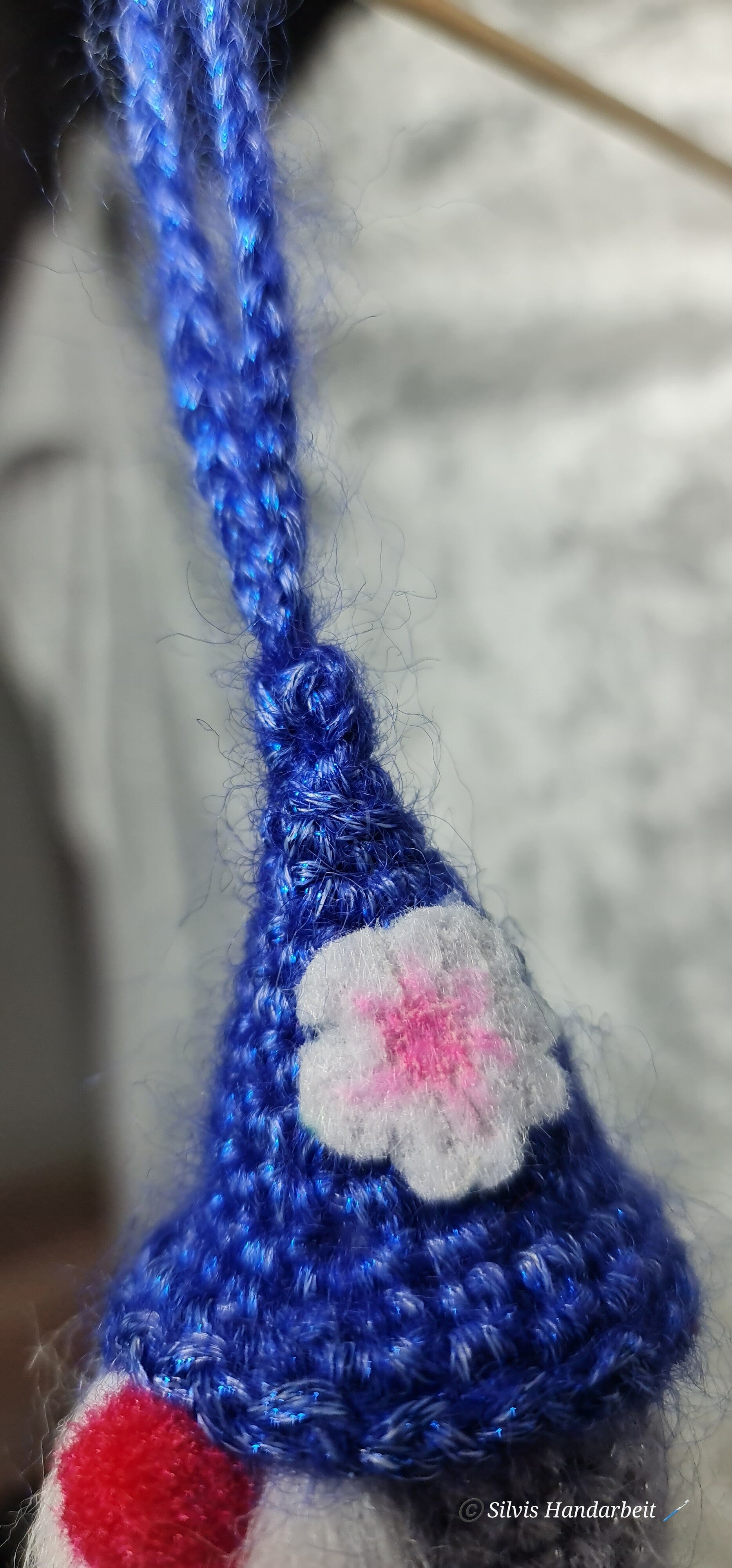 Dieser Wichtel besticht durch sein leuchtendes, königsblaues Mützchen mit dezentem Glitzereffekt. Verziert mit einer kleinen weißen Blüte an der Seite, ist er ein eleganter und fröhlicher Blickfang. Sein langer, weißer Bart und das rote Näschen runden den klassischen Wichtel-Look ab.